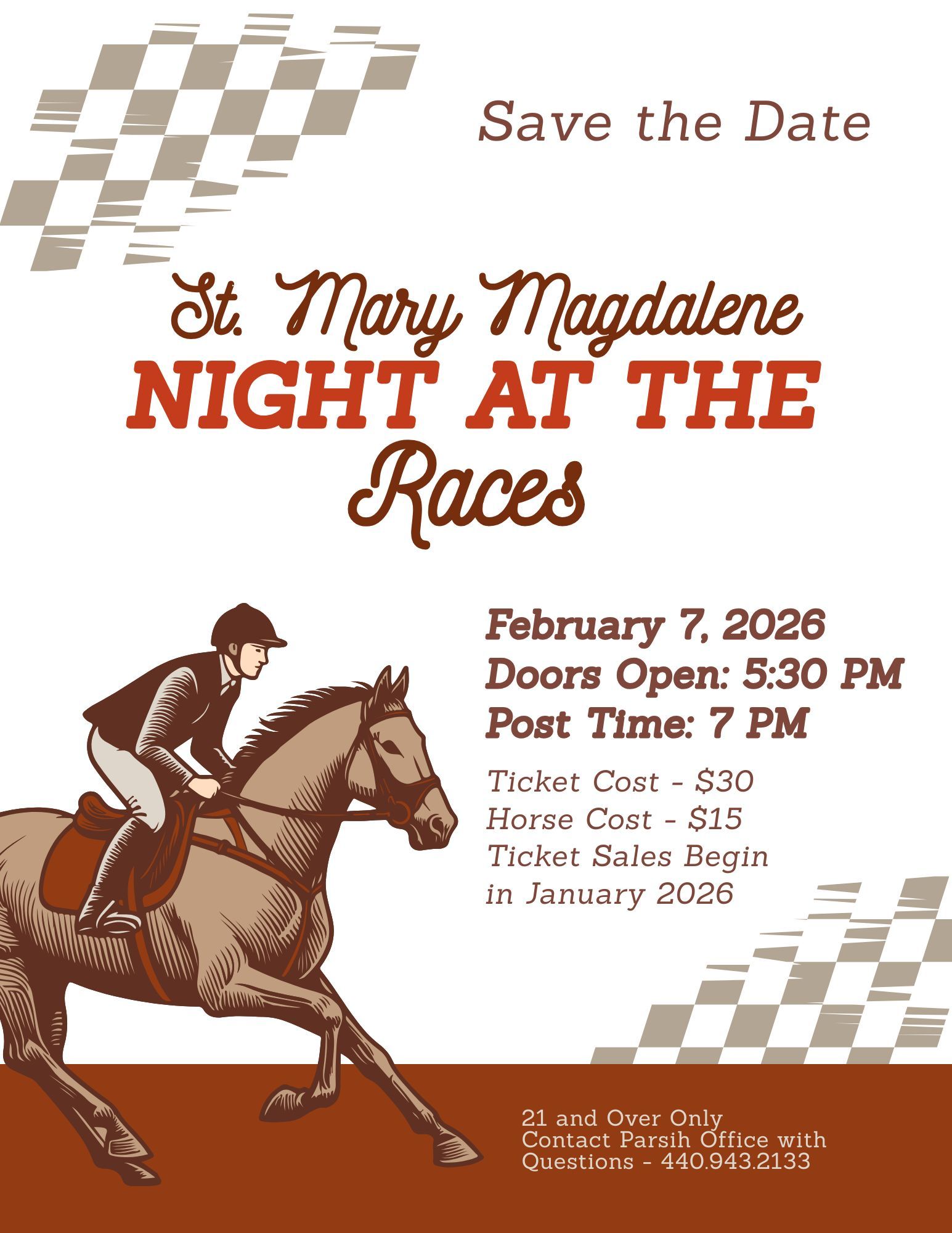 The Track is Back on Vine! St. Mary Magdalene hosts a Night at the Races fundraiser that offers dinner, sideboards, 50/50 raffle, betting on horse races, and FUN. Proceeds help support the continued mission and ministry of St. Mary Magdalene.