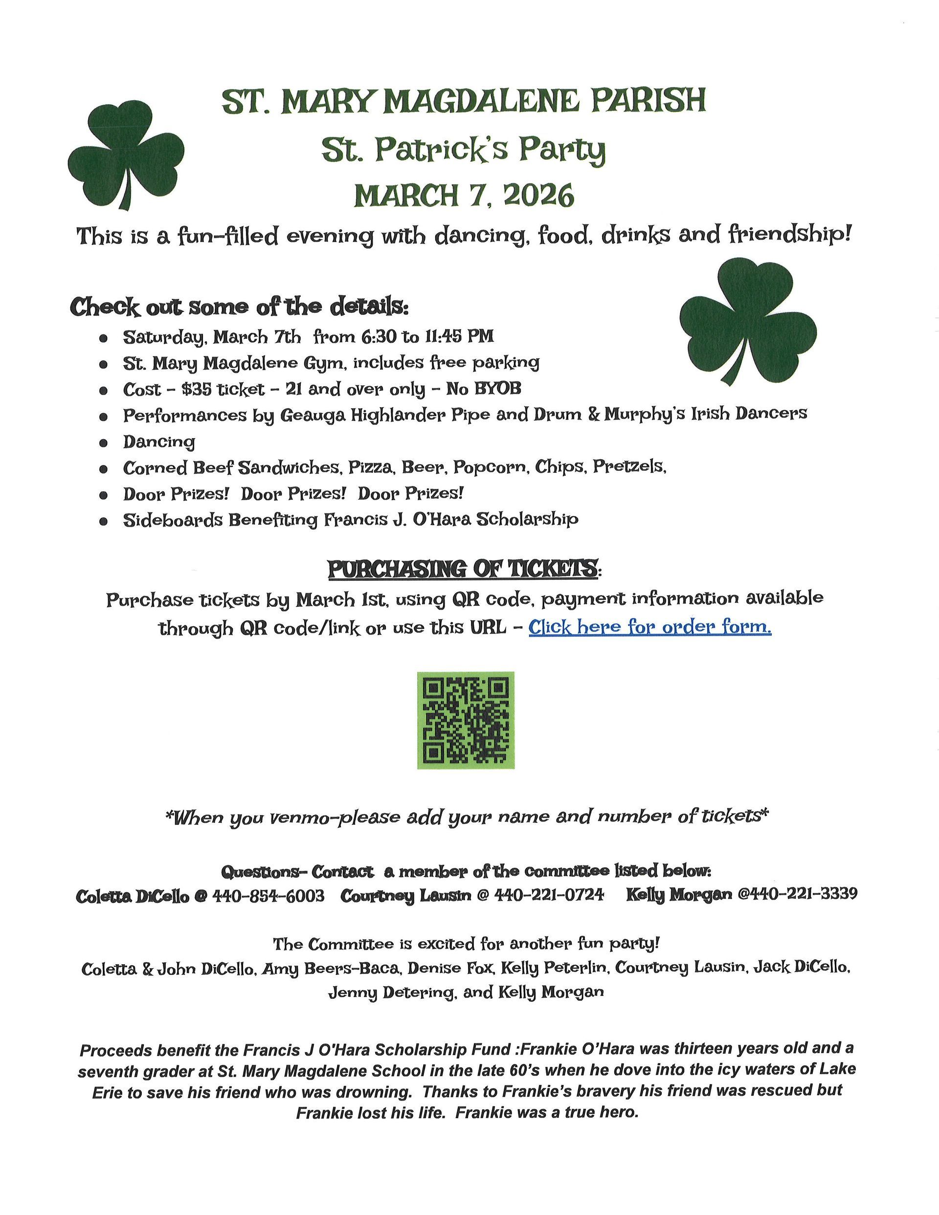 On a Saturday in March, you can find a little bit of Ireland in the SMM Gym. The annual St. Patrick’s Party has been a tradition for over 25 years. It is a great event with plenty of dancing, eating and partying. This party is a fundraiser for the Francis J. O’Hara Scholarship that is given to an 8th grader from SMM Parish who attends a neighboring Catholic grade school and is continuing their education at a Catholic High School. It is awarded in Frankie’s memory who jumped into the frigid Lake Erie back in the 60’s to save his friend from drowning. Frankie O’Hara embodies the Scripture: “Greater love has no one than this that someone lay down his life for his friends”